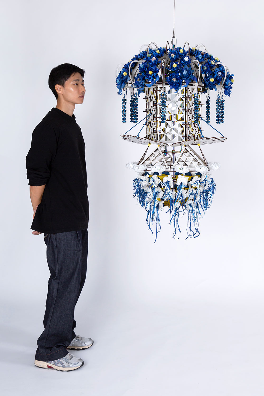 Birch plywood, wood stain, PVD-coated fully threaded stainless steel bolts, PVD-coated stainless steel and stainless steel components, LED bulb, cable, aluminium wires, hinoki wood, alu-dibond, hanji, honeycomb paper balls, stainless steel chains, beads, urethane string, thread, leather cord, stainless steel bells, split rings, stainless steel wire rope