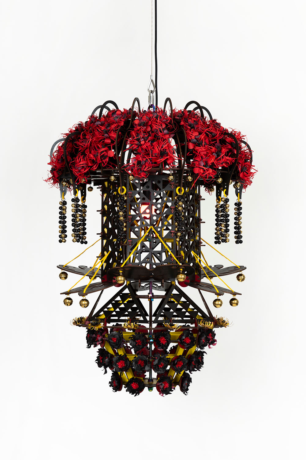 Birch plywood, wood stain, fully threaded stainless steel bolt, stainless steel components, steel wire rope, LED bulb, cable, hanji, powder-coated stainless steel and PVD-coated stainless steel bells, split rings, leather cord