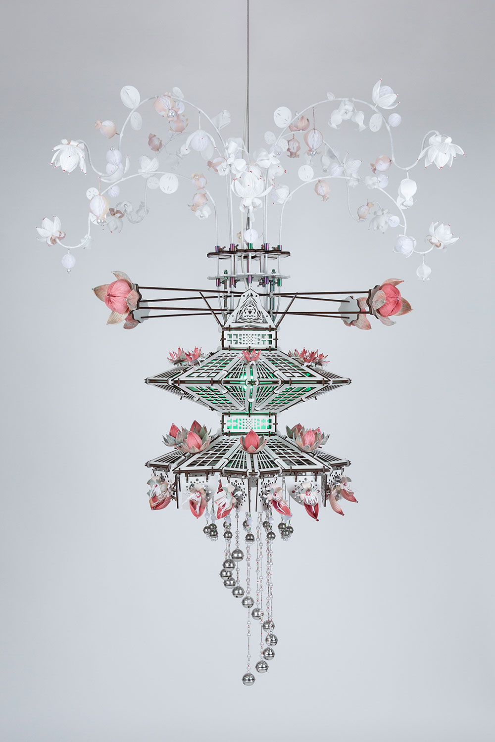 Birch plywood, wood stain, PVD-coated fully threaded stainless steel bolt, PVD-coated stainless steel and stainless steel components, LED bulb, cable, hanji, washi, crepe paper, stainless steel wire rope, stainless steel chains, powder-coated stainless steel bells, stainless steel bells, split rings, gear motor, DMX controller, real-time data
